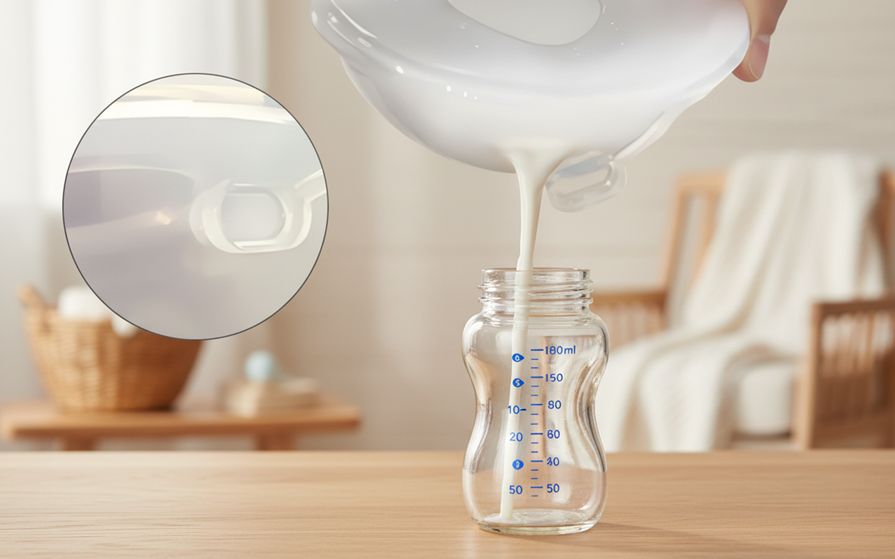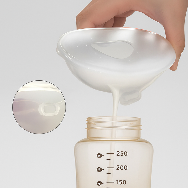 ضعيها فقط داخل حمالة الصدر لتجمعي الحليب بهدوء. صب الحليب في الزجاجات سريع وخالٍ من الفوضى.