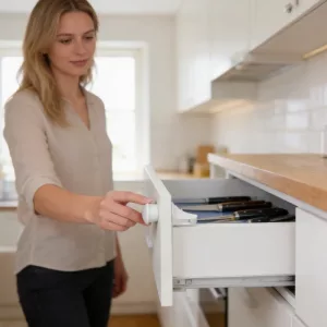 أحب كيف تبقى هذه الأقفال مخفية. الضيوف لا يلاحظون شيئًا، لكن ابننا لا يستطيع فتح درج الأدوية. التركيب استغرق حوالي عشر دقائق لكل الأقفال الأربعة.