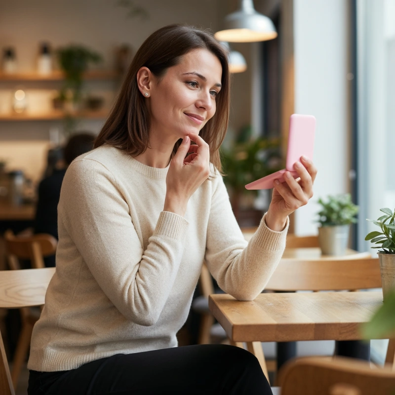 أستخدم هذه المرآة الصغيرة طوال الوقت. الجانب المكبر يسمح لي بتحديد أحمر الشفاه حتى بدون نظاراتي.