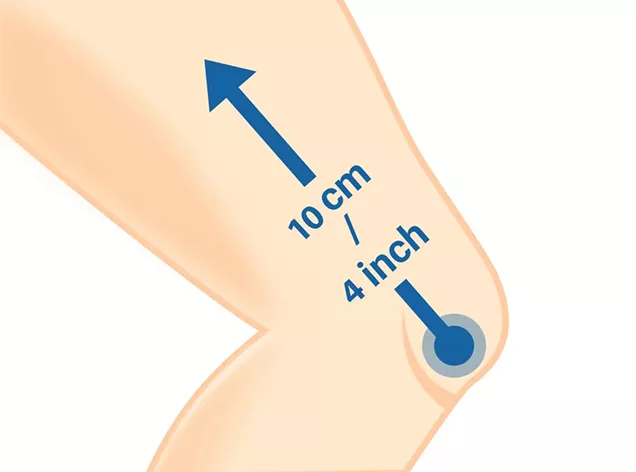 - 2. لف شريط القياس حول أعرض جزء من فخذك على بعد حوالي 10 سم / 4 بوصات فوق منتصف الركبة.