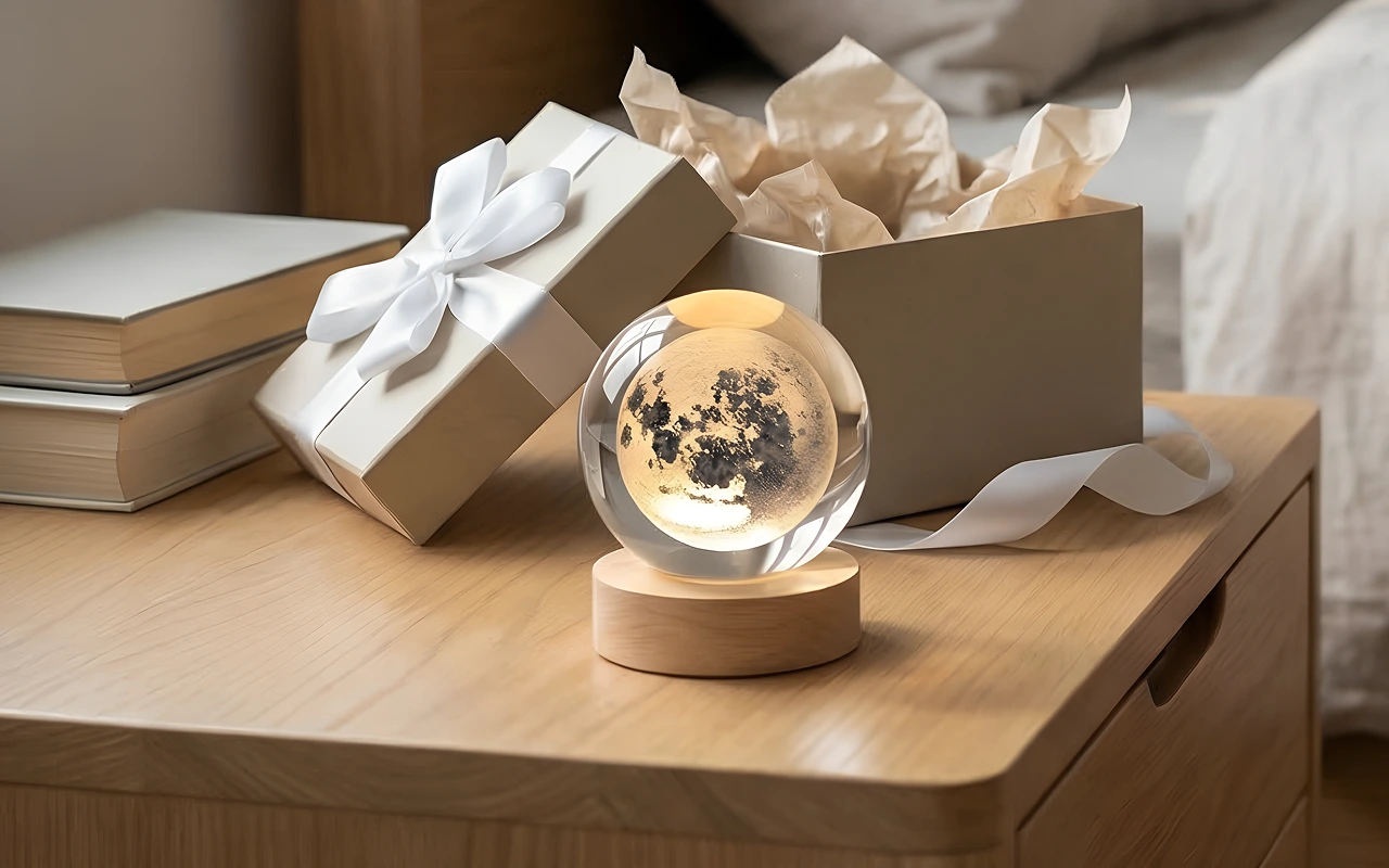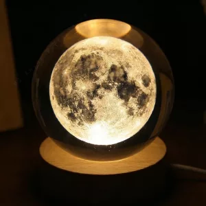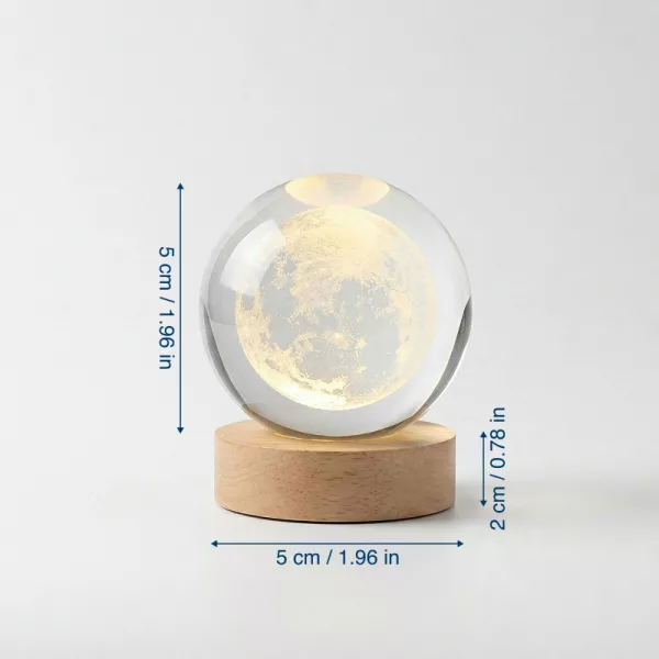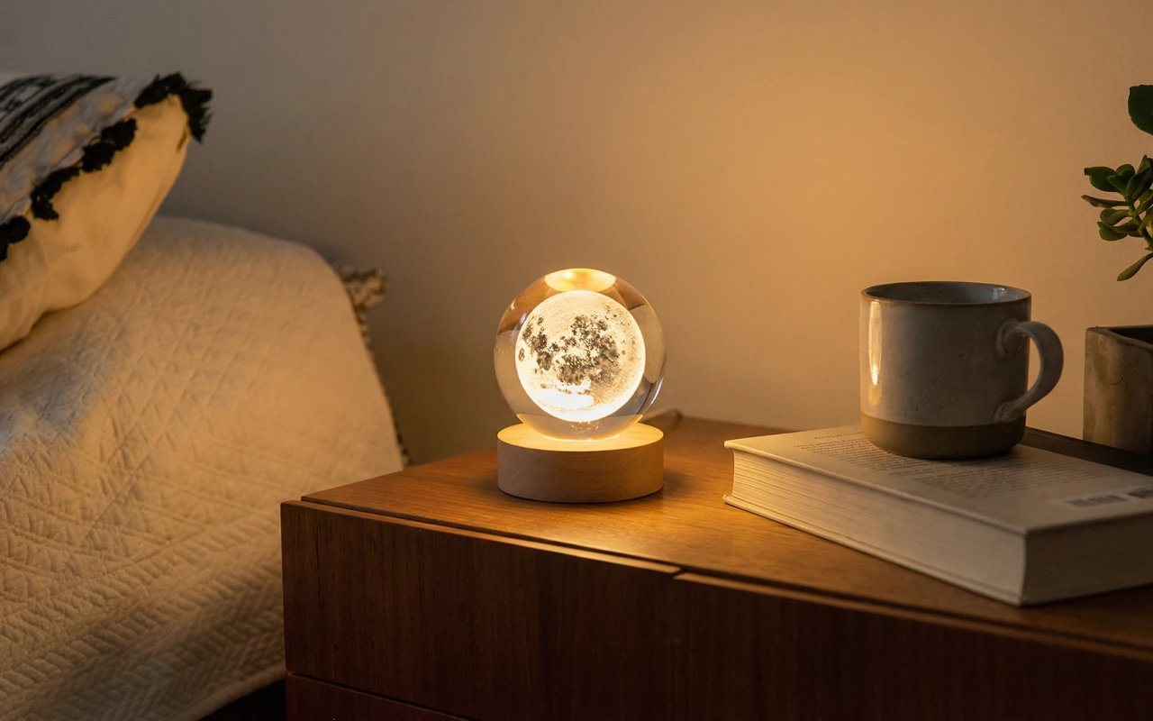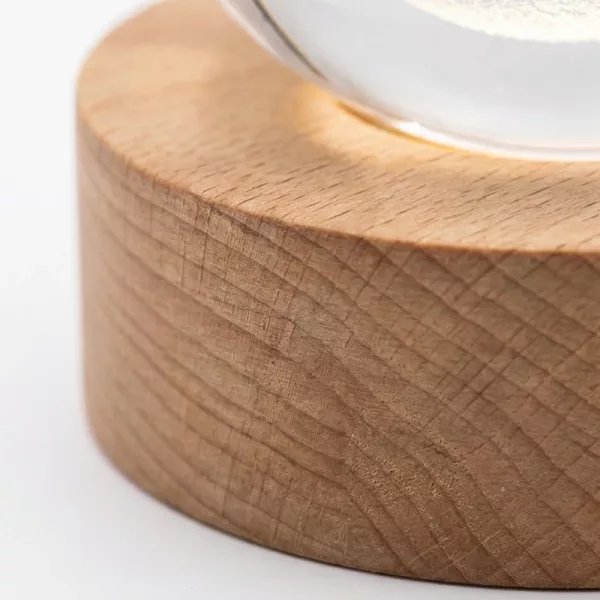 المصباح الكريستالي يبدو أنيقًا على طاولة جانبيّة السرير. القاعدة الخشبية تبدو متينة، والكرة نفسها فيها تفاصيل مدهشة تشبه المجرات.