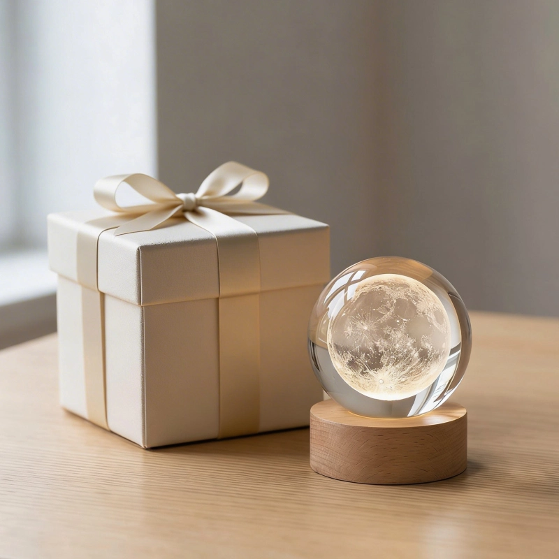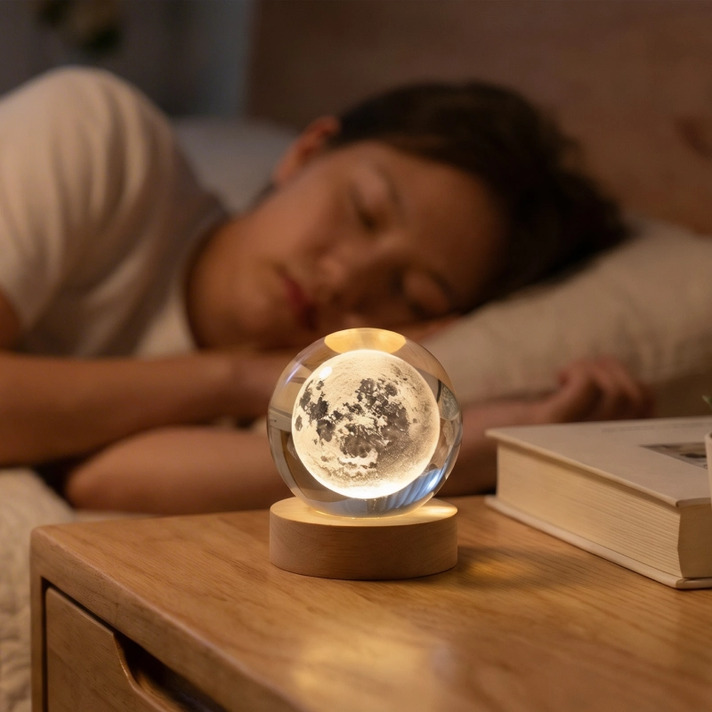 المصباح الكريستالي يبدو أنيقًا على طاولة جانبيّة السرير. القاعدة الخشبية تبدو متينة، والكرة نفسها فيها تفاصيل مدهشة تشبه المجرات.