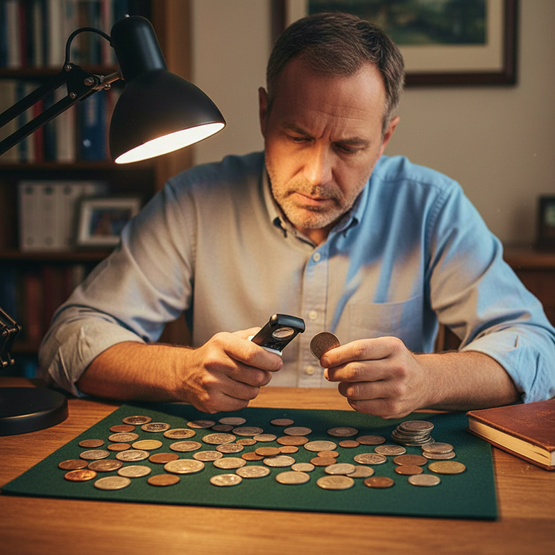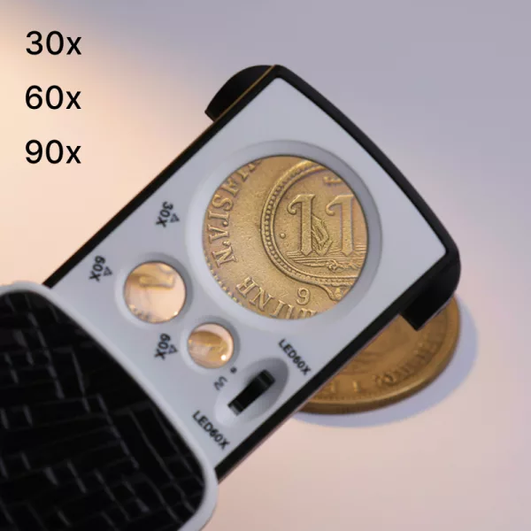 اشتريتها لفحص مجموعة العملات المعدنية لدي. التكبير الثلاثي يُظهر كل خدش صغير وتاريخ الإصدار، والضوء يعمل بشكل ممتاز حتى في القبو.