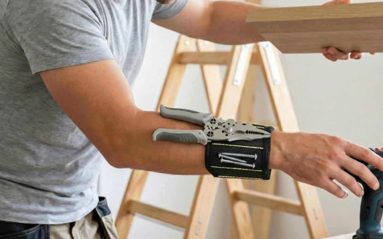 استخدمت سوار المعصم أثناء إصلاح مقابض الخزائن المفكوكة. كان يحيط بذراعي براحة، وبقيت جميع البراغي مصطفة بدلًا من أن تتدحرج عن سطح الطاولة.