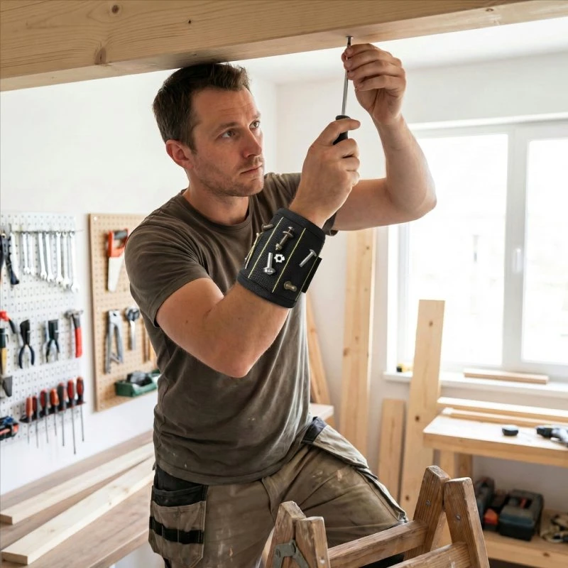 أنا قصيرة، لذا دائمًا أتمدد على السلالم. مع هذا السوار المغناطيسي تبقى المسامير قريبة، ولا أحتاج للصعود والنزول لإحضار المزيد.