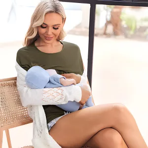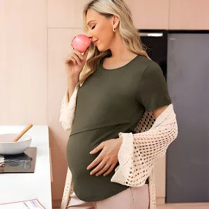 تي شيرت الحمل الناعم من يسهل الرضاعة، مما يجعله ضرورياً كل يوم. بفضل فتحاته الخفية، يمكنك إطعام طفلك بسهولة. النسيج الممتاز يشعر بالنعومة على بشرتك ويتكيف مع جسمك. ابقِ مرتاحاً وواثقاً أثناء رعاية طفلك الصغير.