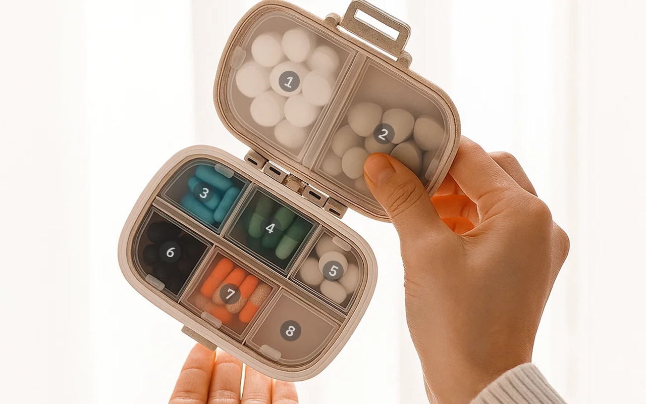يمكنك ترتيب جرعاتك حسب اليوم أو النوع حتى لا تختلط الأدوية. كل قسم يفتح بشكل منفصل، مما يساعدك في أخذ ما تحتاجه بسرعة.