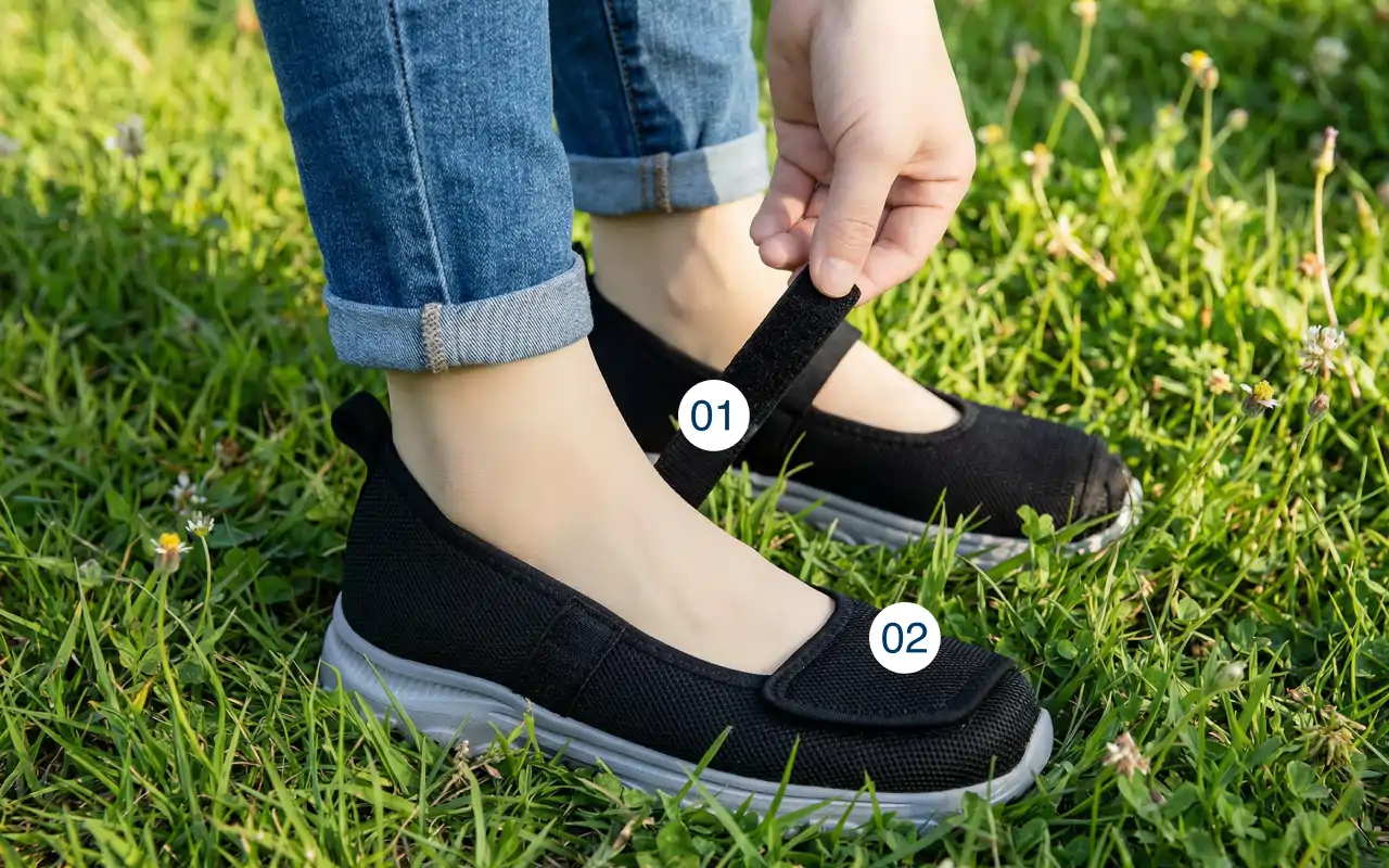 إغلاق بسيط يسمح بتعديلات سريعة مع تغيّر حجم القدم على مدار اليوم. هذا يساعد على منع الشعور بالضيق الناتج عن التورم أو الحساسية.