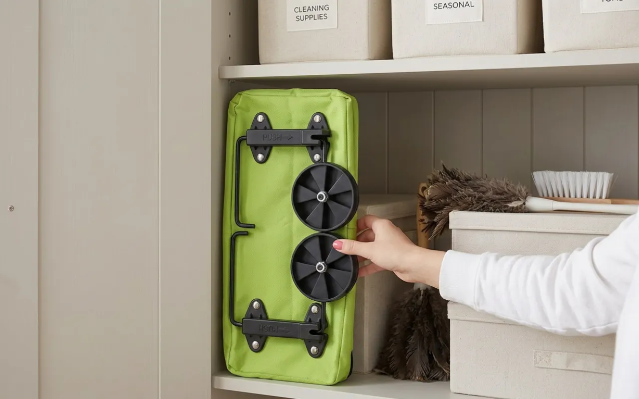 اشتريت هذه العربة بعد جراحة في كتفي. الآن أحمّل زجاجات الماء الثقيلة والفواكه دون قلق. تُطوى في ثوانٍ وتنزلق بسهولة بجانب خزانة الملابس.