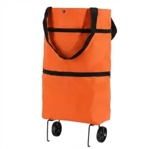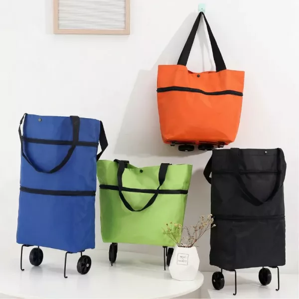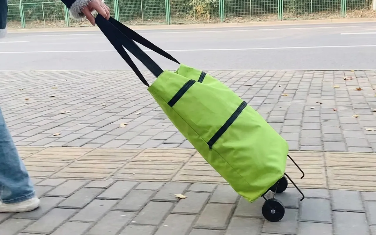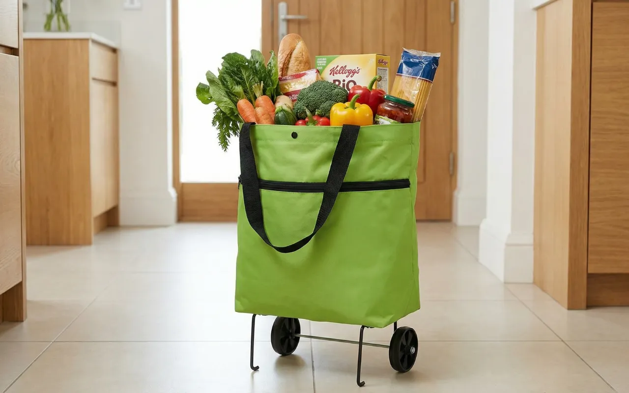 اشتريت هذه العربة بعد أن قلق حفيدي من حملي للأكياس. الآن أدحرج كل شيء إلى المنزل بسلاسة، حتى فوق الحواف. تُخزَّن بشكل مسطح بجانب رف الأحذية.