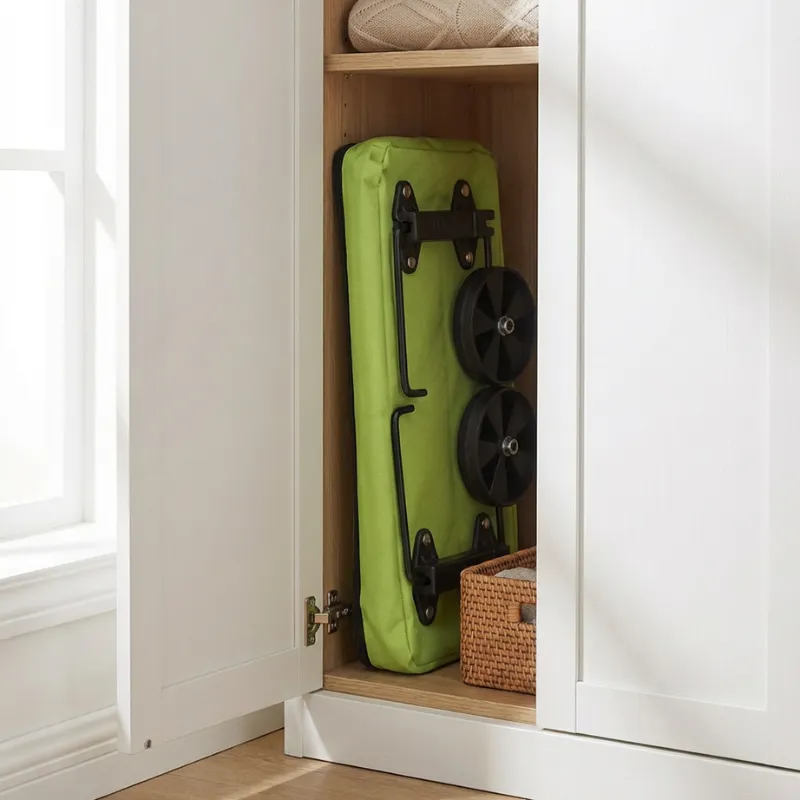 تُطوى العربة إلى حزمة رفيعة تناسب الخزائن الضيقة. الهيكل خفيف الوزن يتدلى بشكل مرتب خلف الأبواب، مما يحرر مساحة ثمينة في الممر.