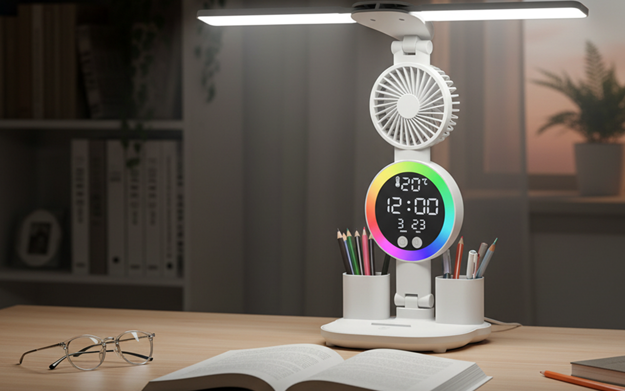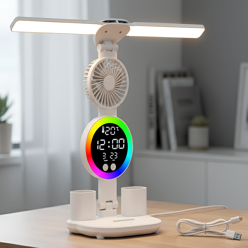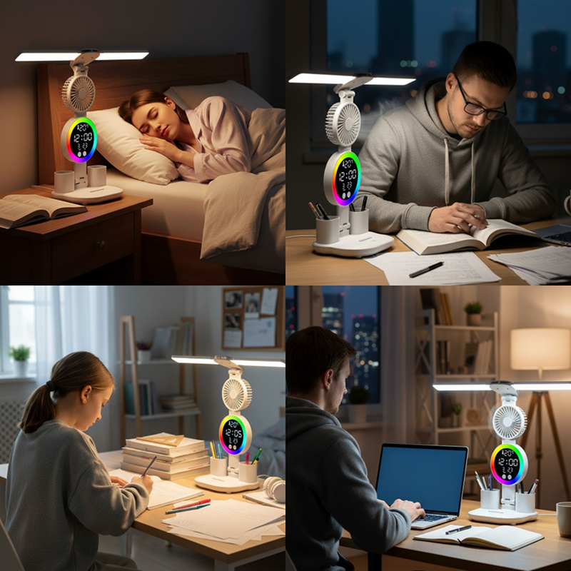 تجعل العيون المتعبة والغرف الخانقة الدراسة صعبة ومرهقة. يعطيك مصباح المكتب من إضاءة ساطعة وناعمة تساعدك على القراءة لفترة أطول والبقاء مرتاحًا. التبريد المدمج يضمن لك الشعور بالانتعاش حتى أثناء المشاريع الطويلة. حول مساحتك إلى المكان المثالي للتعلم أو الاسترخاء.