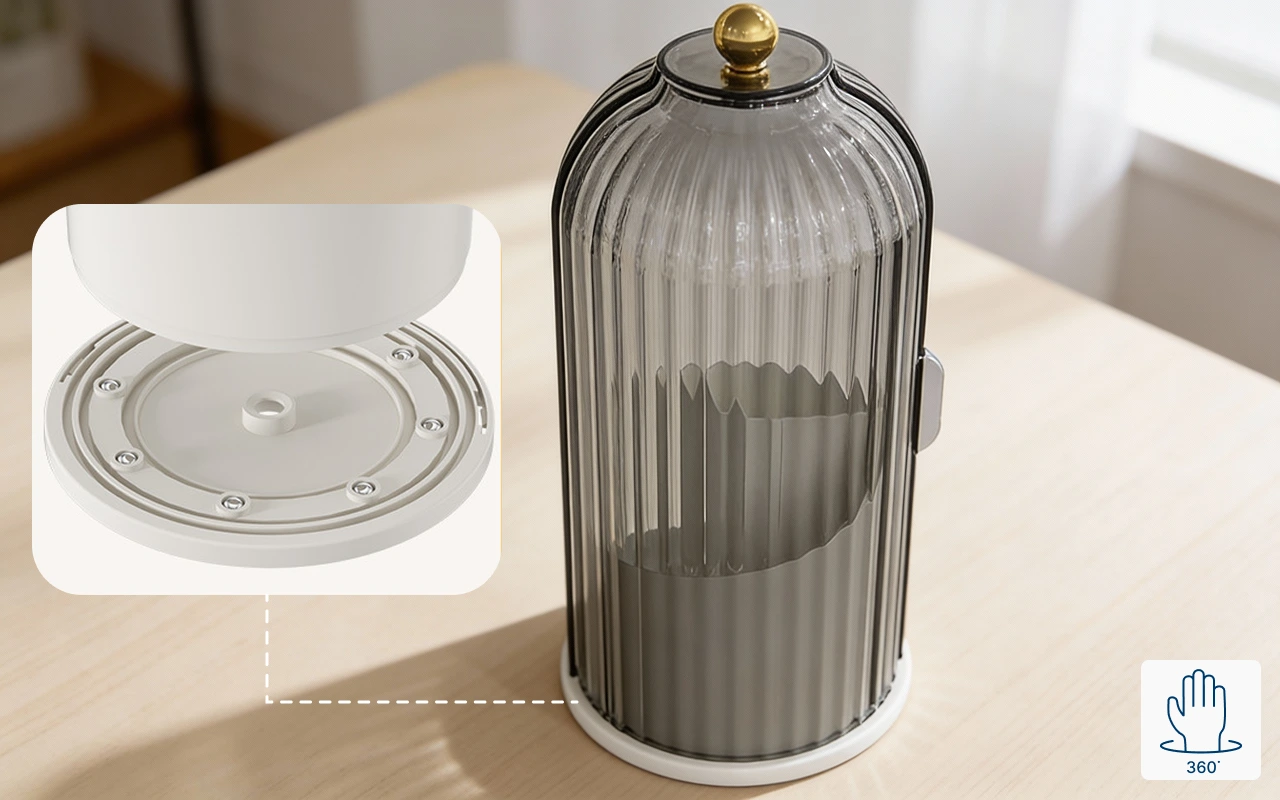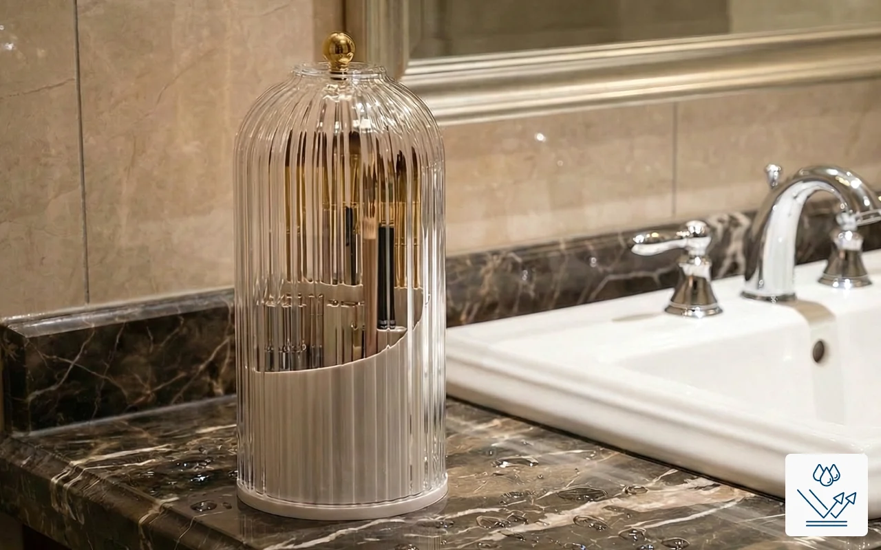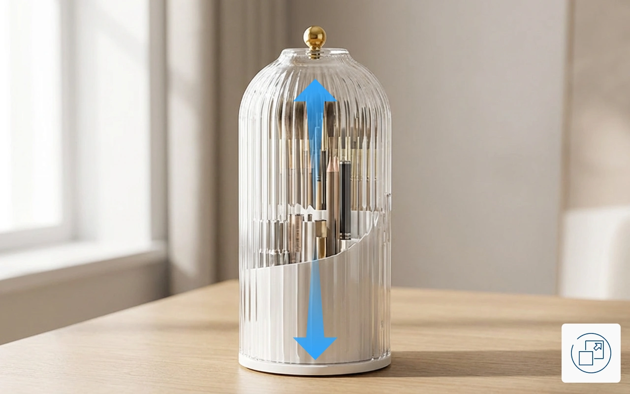 الطاولات الفوضوية تجعل العثور على الأشياء صعبًا وتهدر الوقت. منظم المكياج من ينظم كل شيء ويحافظ على ترتيب مساحتك. تصميمه الذكي يتيح لك رؤية كل فرشاة بسرعة. كل أداة تبقى محمية وجاهزة للاستخدام.