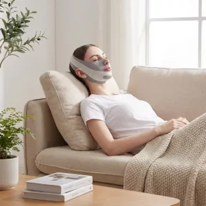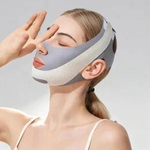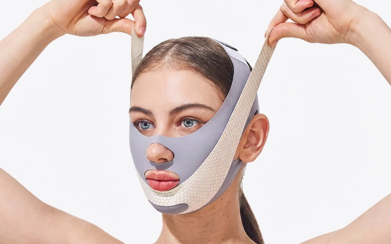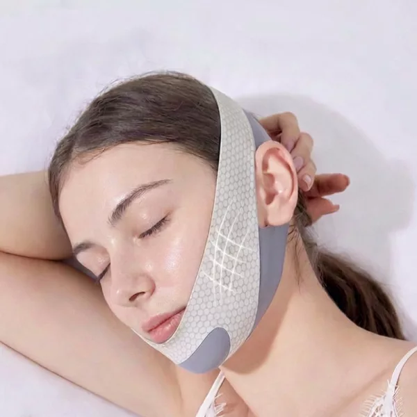 أرتدي رباط الـ V للوجه أثناء القيام بالأعمال المنزلية. القماش يبدو مطاطيًا وناعمًا، ومنطقة الفك المترهلة لدي بدأت تبدو أكثر نعومة ورفعًا.