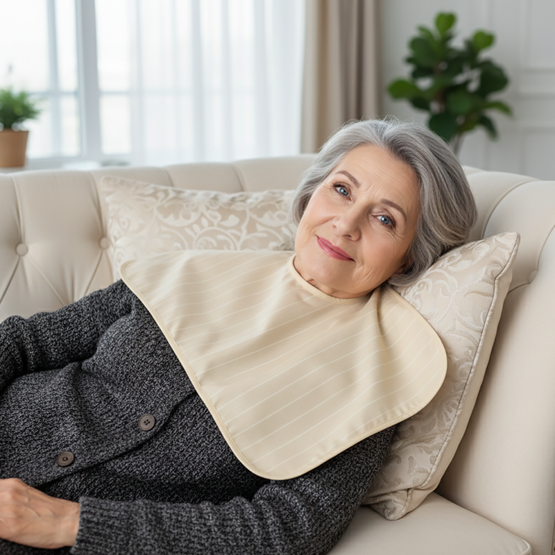 هذه المريلة تحافظ على جفاف قمصاني وخلوها من البقع عندما أتناول الحساء. تشعرني بالنعومة على رقبتي ولا تزعجني أبداً حتى بعد ساعات طويلة.