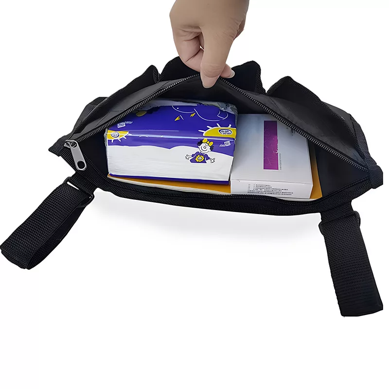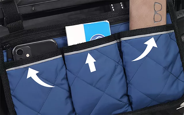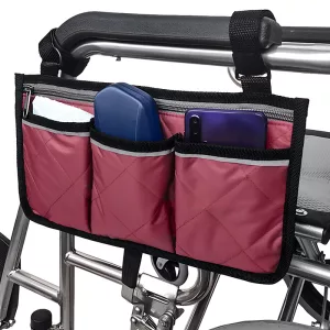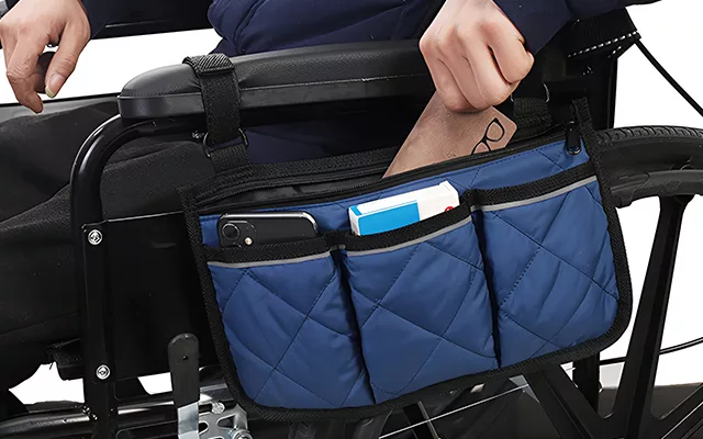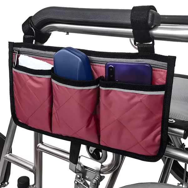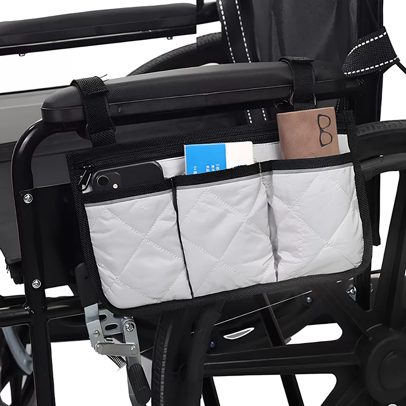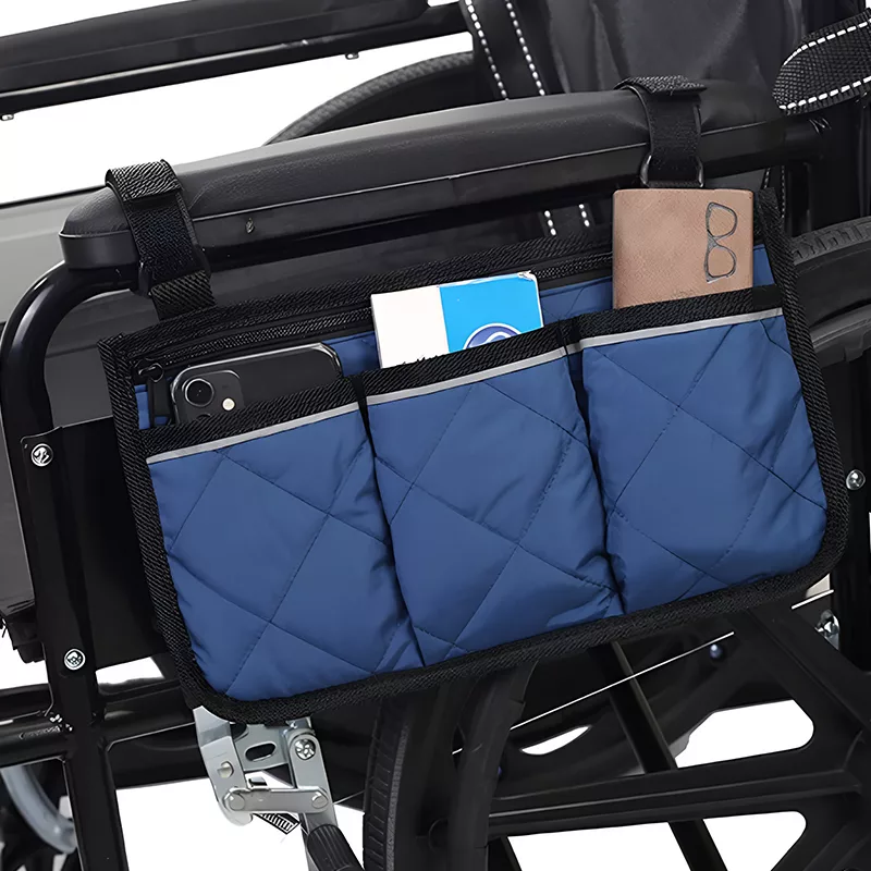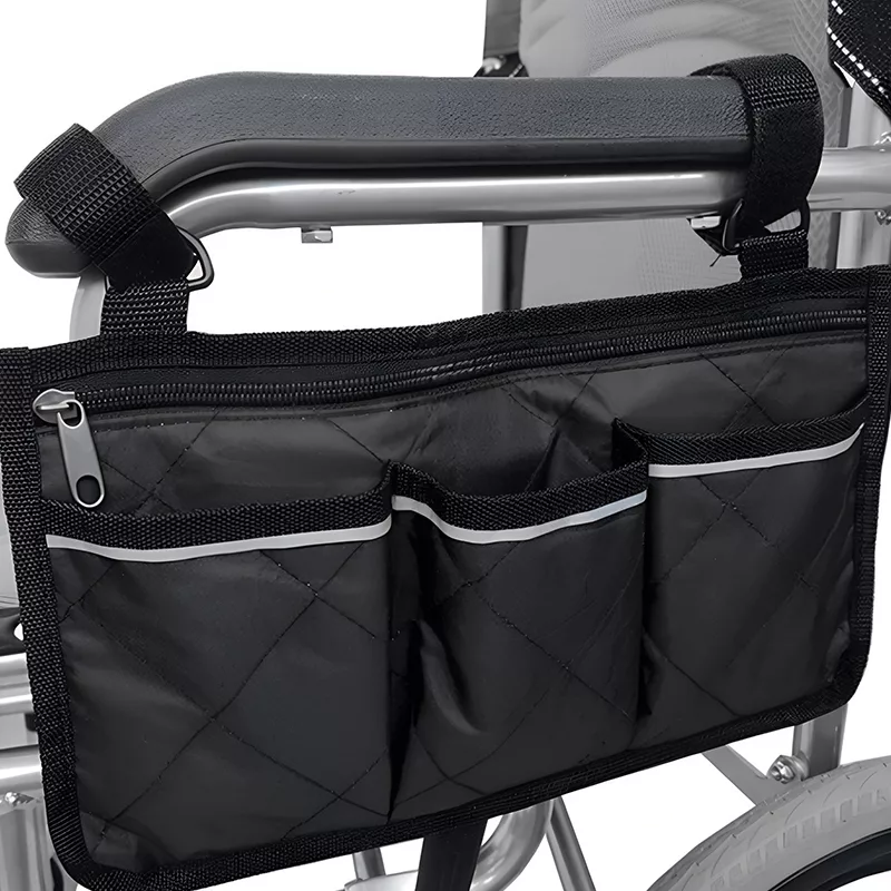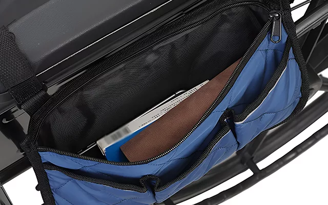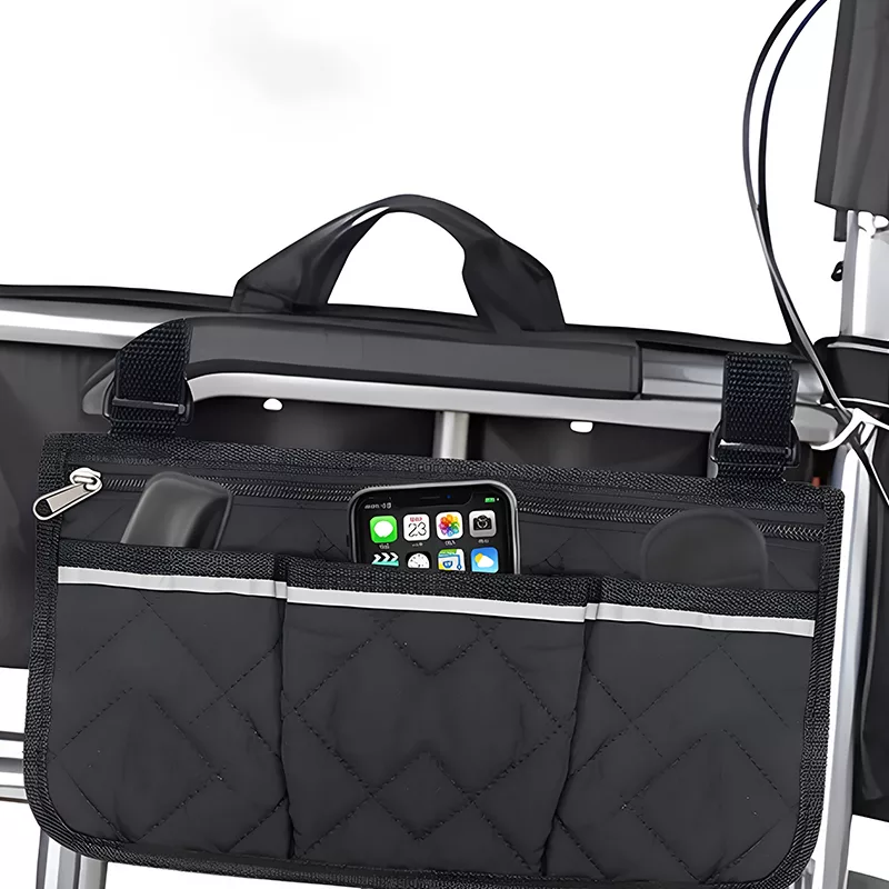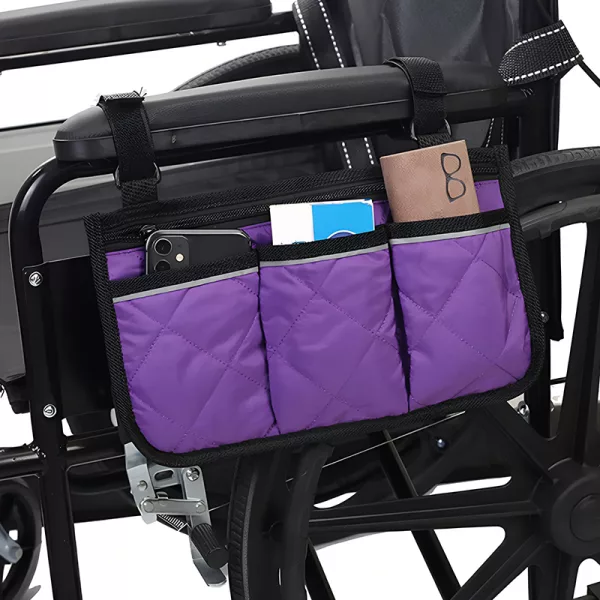 حقيبة الكرسي المتحرك من تثبت بإحكام وتبقى في مكانها. الجيوب المتعددة تُبقي الأشياء مرتبة وسهلة المنال. الشريط العاكس يعزز الرؤية للسلامة ليلاً.