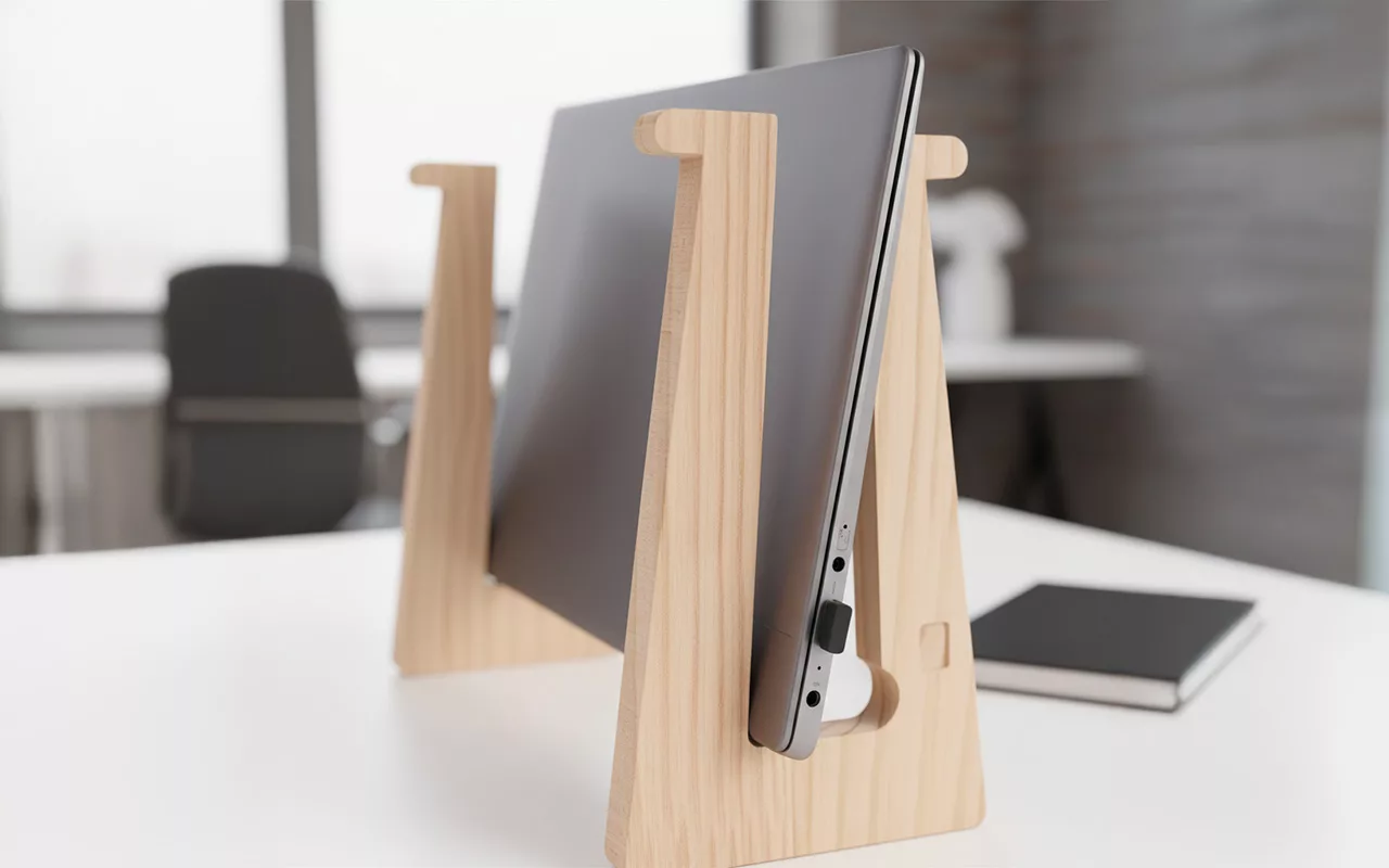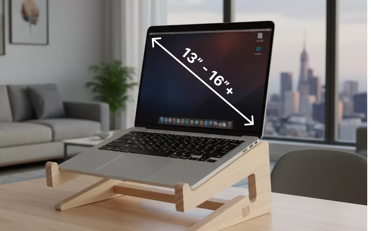 حاملنا الخشبي متوافق مع معظم أحجام أجهزة اللابتوب وأنواع لوحات المفاتيح.