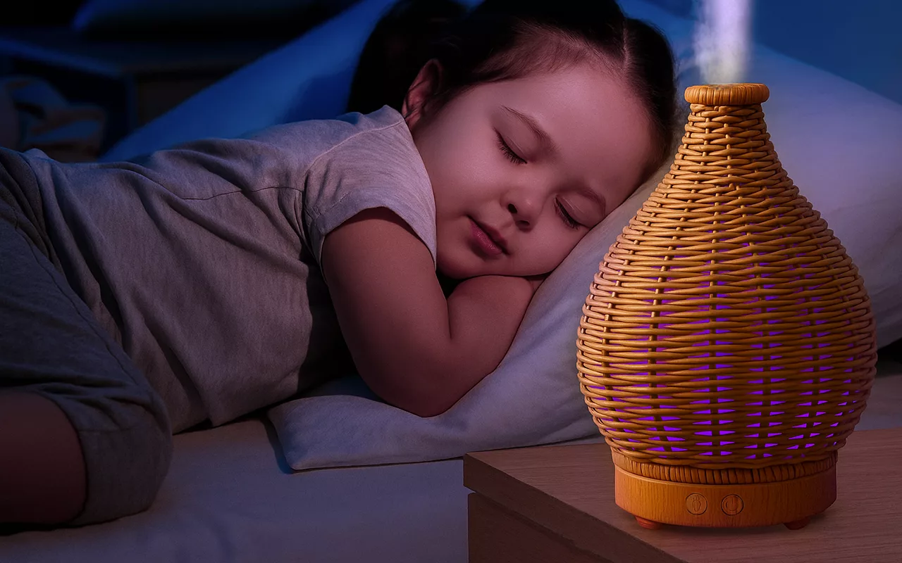 أخي الصغير ينام الآن بدون أي تعب. الضوء يضفي عليه شعوراً بالأمان وغرفتنا تفوح برائحة رائعة مع قطرات النعناع.